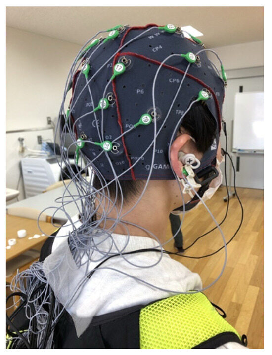 EEG measurements were conducted using active electrodes and a Polymate V AP5148 biosignal acquisition system (Miyuki Giken Co., Ltd., Tokyo, Japan). The recording electrodes were positioned at 28 sites (FPz, Fz, Cz, Pz, Oz, Fp1, Fp2, F7, F8, F3, F4, C3, C4, C5, C6, P3, P4, P7, P8, O1, O2, T7, T8, CPz, CP1, CP2, PO3, and PO4) according to the international 10–10 system [33]. The ground electrode was placed on the spinous process of the seventh cervical vertebra (C7), and the reference electrode was attached to the right earlobe. In addition, Electro Oculography (EOG) electrodes were placed above and below the eyes to detect eye movement and blinking. The sampling frequency was set to 1000 Hz.
