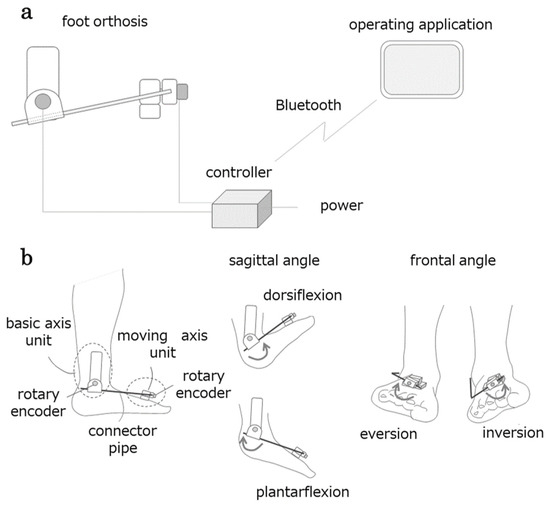 Configuration of the articulation motion assessment system (AMAS). The AMAS comprises three components: a foot orthosis, a controller wirelessly connected to the operating application, and a foot orthosis (a). The foot orthosis measures the angles of the sagittal and frontal planes of the foot using a unit incorporating a rotary encoder on the basic axis and moving axis side (b).