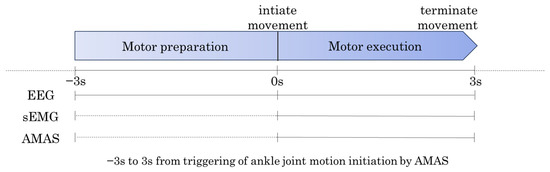 The data for the ankle dorsiflexion task were triggered by the start of the ankle movement detected by the AMAS. Each trial consisted of a 6 s period, spanning from 3 s before movement onset to 3 s after movement onset. Data from 10 trials were extracted for the analysis (Figure 4).