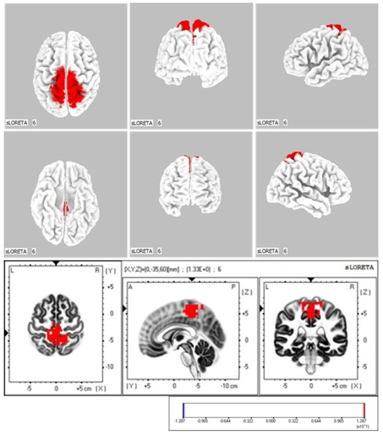 Standardized low-resolution brain electromagnetic tomography (sLORETA) has been employed to visualize and quantify brain neural activity [60]. Neural activity within brain regions was calculated as the current source density, expressed in μA/mm2 × 10−3. The regions of activity were identified using Brodmann’s area (BA) and Montreal Neurological Institute (MNI) coordinates [61]. Global Field Power (GFP) values were computed for both groups (CMC-high and CMC-low) using the sLORETA Averager software [60]. The neural activities of the two groups were compared using the sLORETA statistical non-parametric mapping [62]. Brain regions with significant differences in activity (p < 0.05) were identified and visually represented using color-coded maps.