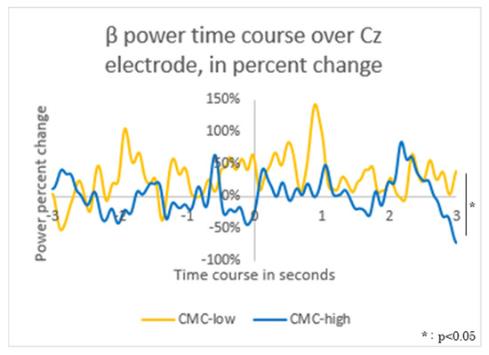 The β power values at Cz showed a significant difference between the groups (p < 0.001) during −0.5 to 0 ms relative to movement onset (CMC-high: −0.40 ± 0.24 [μV2], CMC-low: 1.03 ± 0.93 [μV2]) and during 0.5 to 1 ms (CMC-high: −0.06 ± 0.70 [μV2], CMC-low: 1.12 ± 0.72 [μV2]) (Figure 6).
