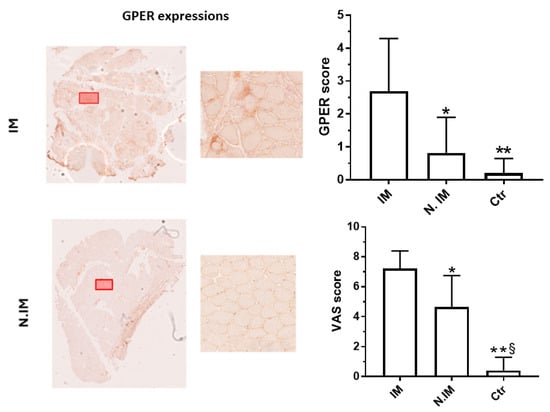 On the left, full muscle biopsy sections from inflammatory myopathy (IM) and non-inflammatory myopathy (N.IM) cases, demonstrating differential expression of GPER. The red boxes highlight areas with higher muscle fibers density. These areas are magnified in the adjacent panels. In the upper-right panel, histograms display the GPER scores in IM, N.IM, and control subjects (Ctr). Significant differences are indicated by asterisks. IM vs. N.IM: p = 0.023 (*). IM vs. Ctr: p = 0.011 (**). In the lower-right panel, histograms display the VAS scores in IM, N.IM, and Ctr. Significant differences are indicated by asterisks. IM vs. N.IM: p = 0.0004 (*); IM vs. Ctr: p < 0.0001 (**). N.IM vs. Ctr: p < 0.0001 (§).