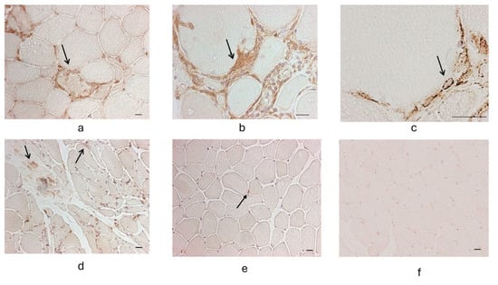 Panels (a–c): cases of inclusion body myositis (IBM). Panel (d): case of myositis, non-IBM. Panel (e): case of non-inflammatory myopathy. Panel (f): negative control. Immunoperoxidase staining for GPER, resulting in the darker brown areas evident in panels (a–e). It is evident an upregulated GPER reactivity, not only in inflammatory cells but also on the sarcolemma and within degenerating fibers (arrows), particularly adjacent to inflammatory infiltrates. Sarcolemmal expression of GPER is very weak in cases with myopathic damage but without prominent inflammation, though it remains detectable in endomysial cells (arrow in panel e). Scale bar: 50 µm (panels a,d,e,f), 100 µm (panel b), 250 µm (panel c).