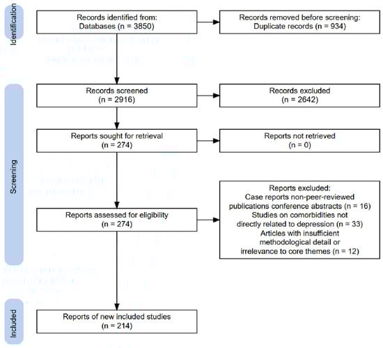 A systematic literature search was conducted following the Preferred Reporting Items for Systematic Reviews and Meta-Analyses (PRISMA) guidelines. The search encompassed electronic databases including Web of Science, PubMed and Embase from 1 January 2010 to 1 June 2025. Key search terms and their combinations included: Depression pathogenesis; Monoamine hypothesis; HPA axis; Neuroinflammation; Oxidative stress; Neuroplasticity; Gut–brain axis; Antidepressants; Herbal antidepressants; Novel therapies. Boolean operators (AND/OR) were used to refine the search. Additional articles were identified through manual screening of reference lists from relevant reviews and primary studies.