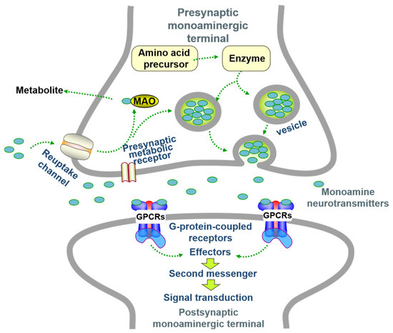 The steps of monoamine neurotransmitter transmission at the synapse (adapted from the reference [26]).