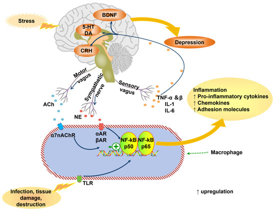 The connection between inflammatory cytokines and depression (adapted from the reference [41]). ACh, acetylcholine; TNF, tumor necrosis factor; IL, Interleukin; nAChR, nicotinic acetylcholine receptor; AR, adrenergic receptor; NF-kB, nuclear factor-kB; TLR, toll-like receptors.