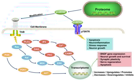 The role of neurotrophic factors in the function of the nervous system (adapted from the reference [72]). proBDNF, the precursor form of BDNF; TrkB, tropomyosin receptor kinase B; NTR, neurotrophin receptor; PLCγ, phospholipase Cγ; IP3, inositol 1,4,5-trisphosphate; DAG, diacylglycerol; PKC, protein kinase C; CAMK, calcium/calmodulin-dependent protein kinase; Ras, rat sarcoma; Raf, rapidly accelerated fibrosarcoma; MEK, MAPK/ERK kinase; ERK, extracellular signal-regulated kinase; PI3K, phosphoinositide 3-kinase; PDK1, phosphoinositide-dependent kinase 1; AKT, serine/threonine-protein kinase B.