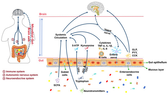The pathways of microbiota-gut–brain axis (adapted from the reference [89]). SCFA, short chain fatty acid; TPH, tryptophan hydroxylase; IDO, indoleamine 2,3-dioxygenase; TDO, tryptophan 2,3-dioxygenase; 5-HTP, 5-hydroxytryptophan; TNF, tumor necrosis factor; IL, interleukin; GLP, glucagon-like peptide; PYY, peptide YY; CCK, cholecystokinin.