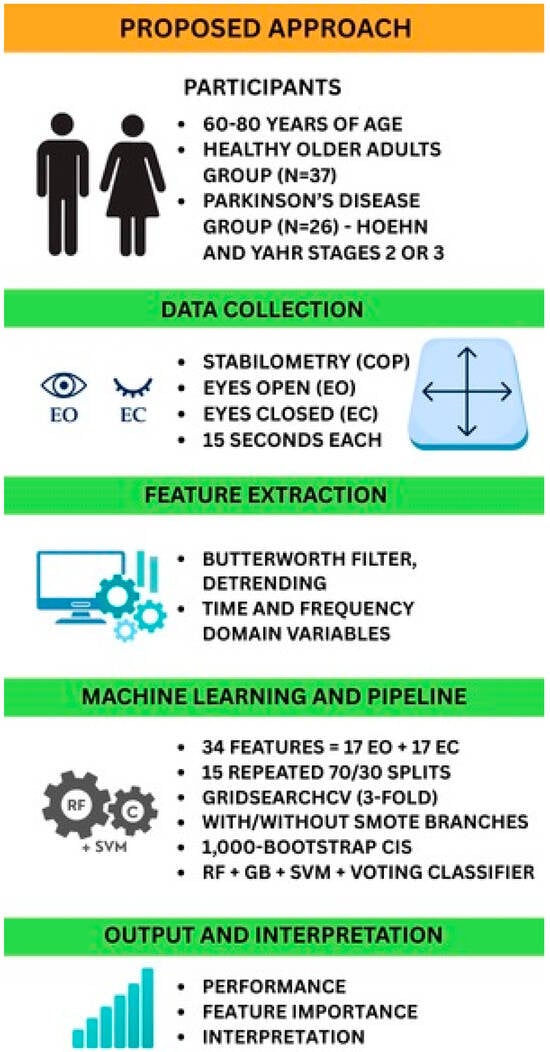Figure 1 provides a schematic of the end-to-end analytical pipeline, from stabilometric data acquisition through final model interpretation. This diagram illustrates each processing stage: data acquisition, preprocessing, feature extraction, statistical analysis, model training and validation, and output interpretation, enabling readers to visualize and reproduce our methodology.