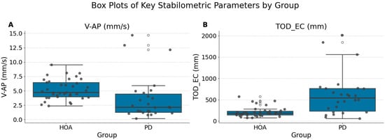 Beyond classification performance, univariate statistical analysis revealed significant differences in stabilometric parameters between the PD and HOA groups, even after correction for multiple comparisons. The reduction in anteroposterior sway velocity (V-AP, mm/s) under eyes-open conditions in the PD group likely reflects the underlying pathophysiological mechanisms, such as increased axial rigidity and bradykinesia, which are hallmarks of Parkinsonian motor impairment. Based on the median values, individuals with PD exhibited significantly lower anteroposterior sway velocity (V-AP (mm/s) (EO): PD Median 2.14 [IQR 3.24] vs. HOA Median 4.73 [IQR 2.48]) and significantly greater total sway path during eyes-closed conditions (TOD_EC (mm): PD Median 542.74 [IQR 531.14] vs. HOA Median 186.89 [IQR 90.65]) than HOA participants. These observations are consistent with those reported in the literature [