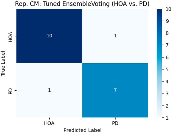 The dataset showed a moderate class imbalance (HOA n = 37, PD n = 26; ratio ≈ 1.42:1). To assess any impact of imbalance on model behavior, we ran the complete pipeline with and without Synthetic Minority Over-sampling Technique (SMOTE). When used, SMOTE was applied only to the training partition inside each cross-validation fold during hyperparameter tuning and inside each bootstrap split at evaluation; test sets were never augmented. This design prevents leakage while allowing a direct, paired comparison of performance with vs. without oversampling.