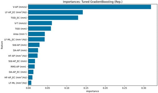 Given the number of stabilometric features (n = 34) relative to the moderate sample size, explicit feature selection procedures (e.g., filter or wrapper methods) were considered during preliminary analyses. However, owing to the inherent feature-selection capabilities of Random Forest and Gradient Boosting models, both of which automatically prioritize features by importance, we opted to rely on their embedded feature-selection mechanisms, thus preserving model interpretability and methodological simplicity. For the tree-based models (Random Forest and Gradient Boosting), feature importance (derived from the mean decrease in impurity or similar measures) was extracted from models trained on the training data from the first data split. This analysis aimed to identify the stabilometric variables that contributed most significantly to the discrimination between the HOA and PD groups.
