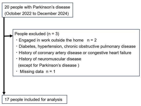 This retrospective, cross-sectional, single-center study included outpatients evaluated at Kawamura Hospital between October 2022 and December 2024 selected through convenience sampling. The inclusion criteria were as follows: (1) PD diagnosed by a neurologist, (2) PD classified as Hoehn and Yahr (HY) stages 1 to 4, and (3) ability to walk independently with or without assistive devices. The following were the exclusion criteria: (1) engagement in work outside the home at the time of study participation, (2) uncontrolled diabetes or hypertension, (3) chronic obstructive pulmonary disease, (4) history of coronary artery disease or congestive heart failure, (5) history of neuromuscular disease other than PD, and (6) missing data.