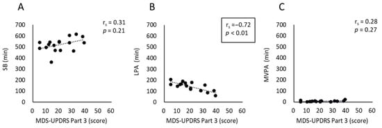 The severity of overall motor symptoms did not influence SB or MVPA. This finding is consistent with the findings of previous studies not limited to at-home PA [,,], which reported that individuals with PD spend most of their day inactively regardless of the severity of their motor symptoms. Even individuals with mild to moderate motor symptoms were classified under SB [,,], and most individuals performed little MVPA [,]. For example, Pradhan and Kelly [] reported that individuals with mild PD spend only 2.7% of their awake time on MVPA.