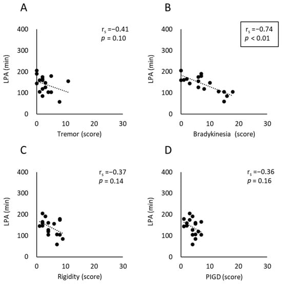 The results of Spearman’s rank correlation analyses between each of the four major motor symptoms and the time spent in LPA inside the home are shown in Figure 3. The bradykinesia score was significantly correlated with the time spent in LPA inside the home (rs [95% CI] = −0.74 [−0.92 to −0.30], p < 0.01), whereas the tremor, rigidity, and PIGD scores showed no significant correlation with the time spent in LPA inside the home (rs [95% CI] = −0.41 [−0.78 to 0.12], p = 0.10; rs [95% CI] = −0.37 [−0.79 to 0.17], p = 0.14; and rs [95% CI] = −0.36 [−0.67 to 0.06], p = 0.16, respectively).