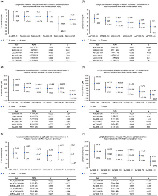 We analyzed plasma concentrations of glutamate, aspartate, glutamine, and glycine in pediatric patients with mTBIs at multiple intervals post-injury (3 h, 6 h, and 12 h and 1, 7, 14, and 28 days afterwards). These measurements were compared to those for the control group. Table 3 presents the mean concentrations (), SDs, and 95% CIs in micromolar (µM), providing a detailed overview of the changes in amino acid levels over time following the traumatic event.