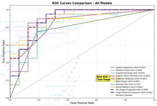 The overall comparison of the suggested two-stage architecture with eight traditional machine learning algorithms on the test set showed better performance on several evaluation measures. The comparison of ROC curves (Figure 1) shows the discriminative power of all models, where the two-stage model obtained the best test set area under the curve of 0.909, followed closely by neural network with 0.906 and random forest with 0.894. The ROC analysis shows that the suggested method has very good sensitivity–specificity trade-offs for all threshold values, with the curve being closest to the upper-left corner, reflecting the best classification performance.