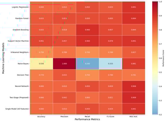 Comparison of performance measures (Figure 2) is provided as the accuracy, precision, recall, F1-score, and ROC-AUC heatmap of all model variants tested. The provided two-stage model was balanced equally with accuracy = 0.806, precision = 0.842, recall = 0.800, F1-score = 0.821, and ROC-AUC = 0.909. Support Vector Machine (SVM) had the best accuracy (0.861) as well as the best recall (0.900) at the expense of slightly lower precision, characteristic of high sensitivity but slightly lower precision. Naïve Bayes had extremely high precision (1.000) with extremely low recall (0.200), typical of too cautious classification with too few true positives and false negatives. Even though the two-stage method did not individually attain the optimal best score, it had the best discriminative power, as the best ROC-AUC revealed, and it had the best all-measures trade-offs, insinuating the best generalizability and calibration for clinical decision support applications.