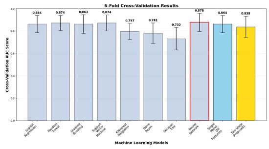 Cross-validation analysis (Figure 3) illustrates model performance stability and generalizability via 5-fold stratified validation with correct two-stage implementation. The two-stage model delivered cross-validation ROC-AUC of 0.838 ± 0.095, with a test vs. cross-validation generalization gap of +0.072. The gap suggests model complexity effects and highlights the necessity of strict cross-validation in two-stage architectures. Comparative analysis reveals that ensemble methods attained more stable generalization, with random forest (0.874 ± 0.067, gap +0.020) and neural network (0.878 ± 0.082, gap +0.028) exhibiting better stability, whereas the proposed method sacrifices some generalization consistency for optimum discriminative performance.