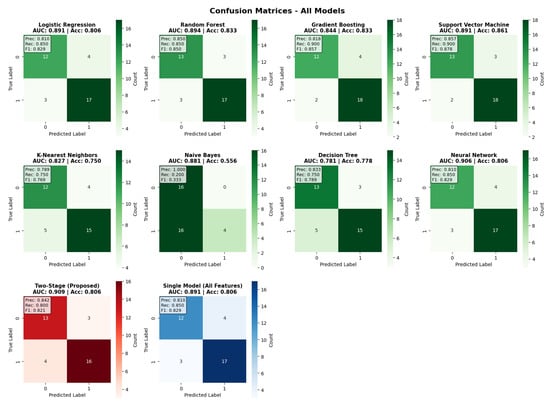 The examination of the confusion matrix (Figure 4) provides an in-depth overview of the classification performance of all models. The two-stage model achieved a balanced classification, with 13 true negatives, 16 true positives, 3 false positives, and 4 false negatives, with a precision of 0.842 and recall of 0.800. Comparative analysis of the models shows that the Support Vector Machine had the highest accuracy thanks to its better specificity, while Gradient Boosting had very good recall (0.900) at the cost of lower precision. The confusion matrices show that the two-stage approach maintains balanced performance without a strong bias toward sensitivity or specificity, therefore confirming its clinical utility for all risk scenarios. Moreover, the error distribution indicates that the two-stage framework reduces false negatives compared to most baseline models, which is particularly relevant in clinical contexts where missed diagnoses carry greater risk.