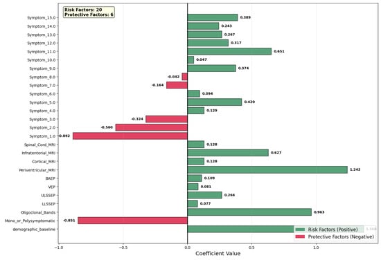 Figure 5 shows the coefficient values of the contributing variables of the prediction model, with risk factors (green, positive coefficients) separated from the protective factors (red, negative coefficients). We identified 20 variables as risk factors, against 6 that were protective factors. Among the predictors, periventricular MRI lesions (coefficient = +1.242) appeared as the highest risk factor, which is evidence in favor of the potential central role of white matter involvement in the clinical course of the disease. Oligoclonal bands (coefficient = +0.963) also showed high positive values, which is evidence in favor of activation of the central nervous system’s immunity system. Other high-risk factors were specific symptoms (Symptom_11.0, coefficient = +0.651) as well as infratentorial MRI lesions (+0.627), which is evidence in favor of increased lesion load as well as clinically relevant symptoms.
