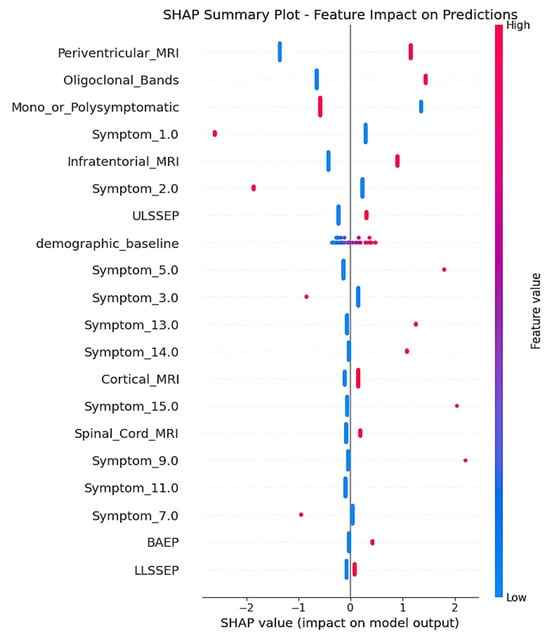 Periventricular_MRI was the most predominant predictor, with the presence of lesions (high feature values indicated in red) demonstrating consistently positive SHAP values up to +2.0. This result is consistent with traditional radiological criteria for MS diagnosis, as periventricular white matter lesions are among the most typical MRI features in initial multiple sclerosis, mirroring the preference of demyelinating processes for regions around the cerebral ventricles where inflammatory infiltration is frequent [13,14]. The persistently high SHAP contributions for positive periventricular findings confirm the clinical significance of this neuroimaging biomarker in predicting conversion.