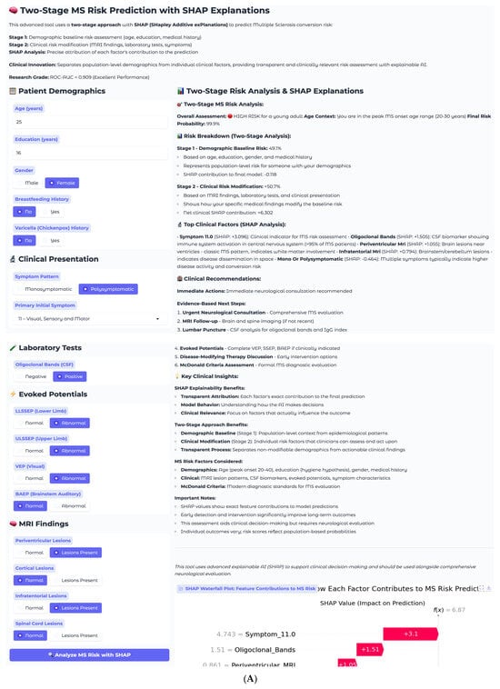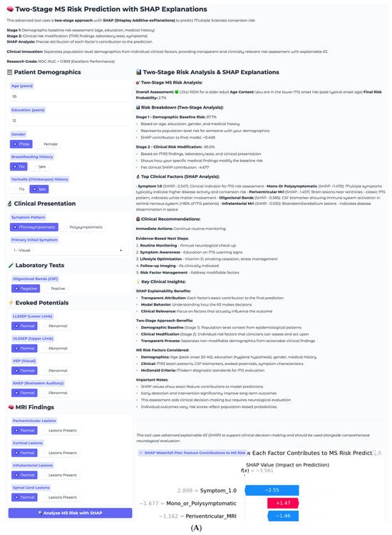 The two-stage MS risk prediction model was implemented as an interactive clinical decision support system with real-time SHAP explanations to demonstrate practical applicability in clinical settings. This implementation provides neurologists with transparent, evidence-based risk assessments for individual patients while separating demographic baseline risk from clinical risk modification, enabling clinicians to understand both population-level context and patient-specific factors driving predictions.