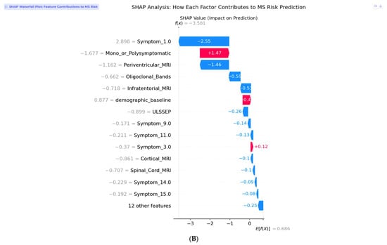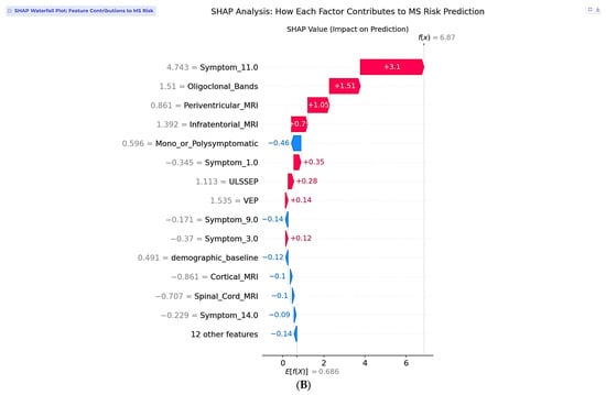 Individual SHAP analysis for this high-risk case reveals a fundamentally different pattern compared to the low-risk example (Figure 8B). Symptom_11.0, representing visual, sensory, and motor involvement, dominates the prediction with a SHAP value of +3.1, reflecting the clinical reality that multisystem presentations indicate extensive central nervous system involvement and higher conversion risk. This finding demonstrates the model’s clinical sophistication in recognizing that symptom complexity often outweighs individual biomarkers in predicting MS progression. Oligoclonal bands contribute strongly with +1.51, consistent with their presence in over 95% of clinically definite MS cases. Periventricular MRI lesions add additional risk at +1.05, while infratentorial involvement at +0.79 further supports the high-risk assessment.