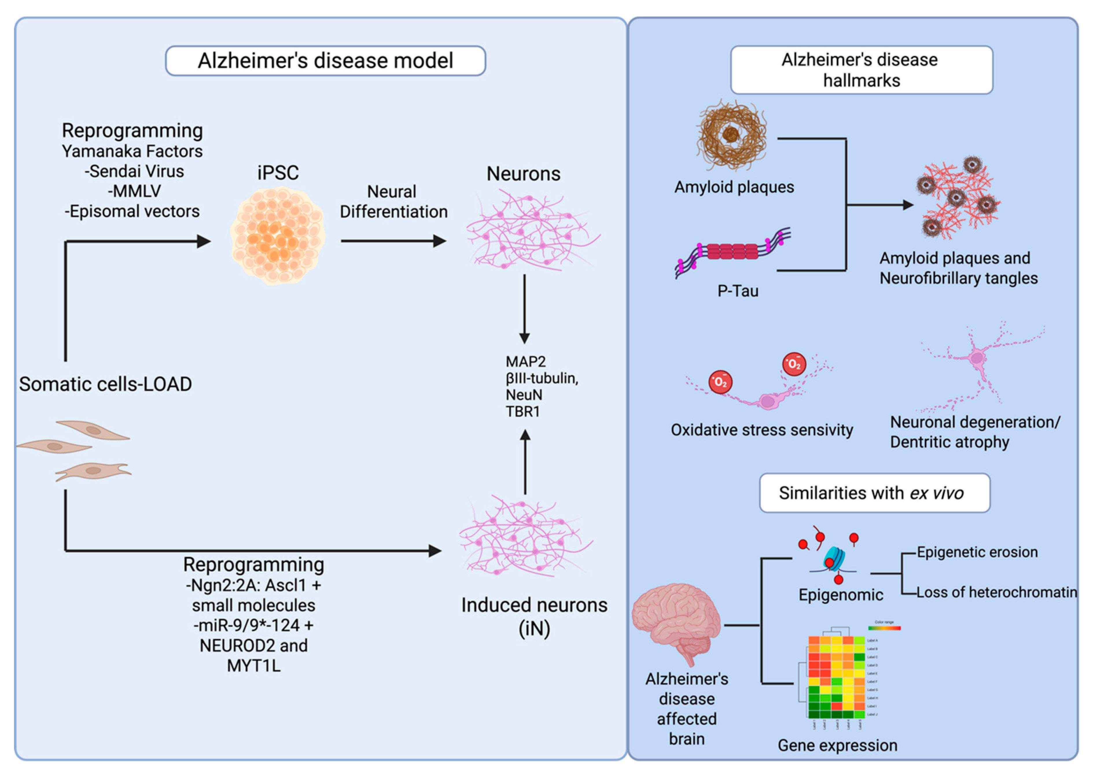 - Sun, Z.; Kwon, J.-S.; Ren, Y.; Chen, S.; Walker, C.K.; Lu, X.; Cates, K.; Karahan, H.; Sviben, S.; Fitzpatrick, J.A.J.; et al. Modeling late-onset Alzheimer’s disease neuropathology via direct neuronal reprogramming. Science 2024, 385, adl2992. [Google Scholar] [CrossRef]