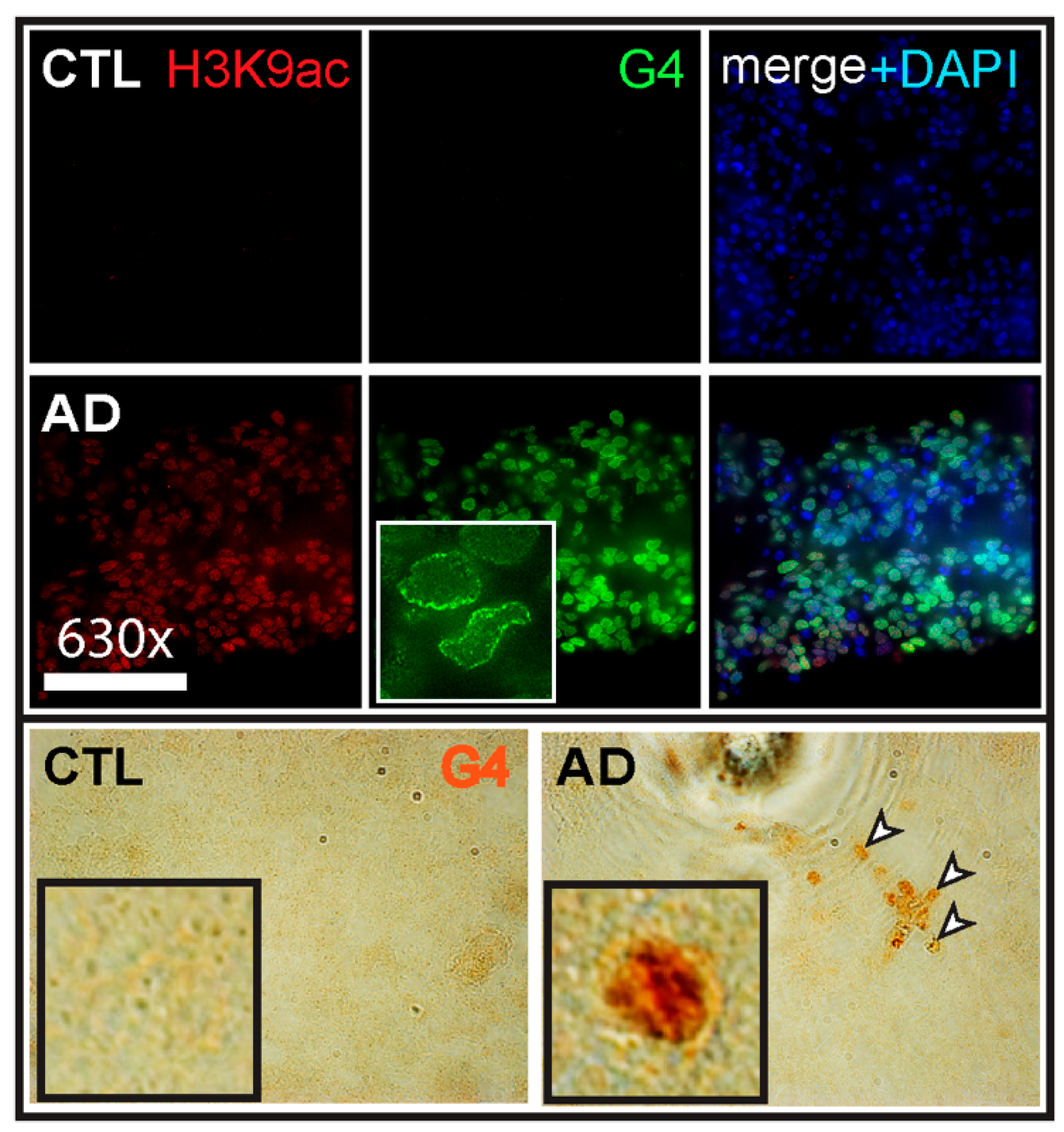 - Hanna, R.; Flamier, A.; Barabino, A.; Bernier, G. G-quadruplexes originating from evolutionary conserved L1 elements interfere with neuronal gene expression in Alzheimer’s disease. Nat. Commun. 2021, 12, 1828. [Google Scholar] [CrossRef]