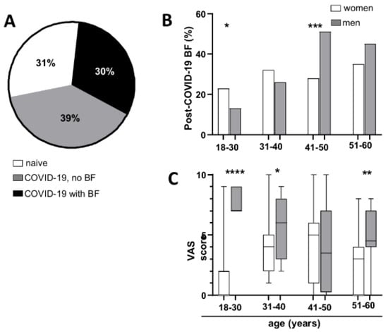 Each participant who reported experiencing BF following their most recent COVID-19 infection was requested to assess the degree of bother caused by BF using a visual analogue scale (VAS) ranging from 1 to 10. As illustrated in Figure 2C, men reported higher levels of bother compared to women (Mann–Whitney test, for age groups, respectively: 18–30 p < 0.0001, 31–40 p = 0.0373, 41–50 p = 0.6947, 51–60 p = 0.0096).