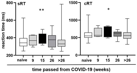 Reaction time at different time intervals after COVID-19. Median, interquartile range, and absolute range are displayed for sRT and cRT relative to the time elapsed after the last COVID-19 illness. Statistical significance is indicated by asterisks (* p < 0.05, ** p < 0.01).
