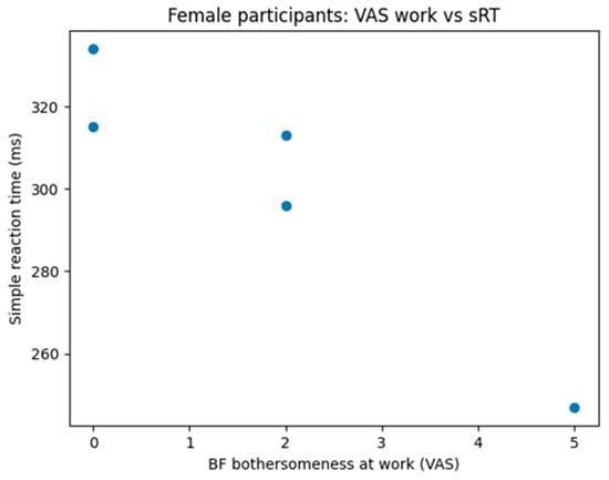 Correlation between perceived brain fog bothersomeness and simple reaction time in female participants. Scatter plot shows individual data points. Spearman correlation analysis revealed a strong negative association between brain fog interference and simple reaction time (ρ = −0.95, p = 0.014).