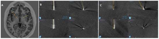 (A) Inverse recovery axial MR image of the planned targets for the second patient. (B,C) show the CT image after final lead placement for right (yellow) and left (blue) electrode, respectively, merged with the preoperative plan to confirm the final position. It is displayed in four different views: top left shows Trajectory 1, bottom left shows Trajectory 2, top right is the sagittal view, and bottom right is the probe’s eye view.