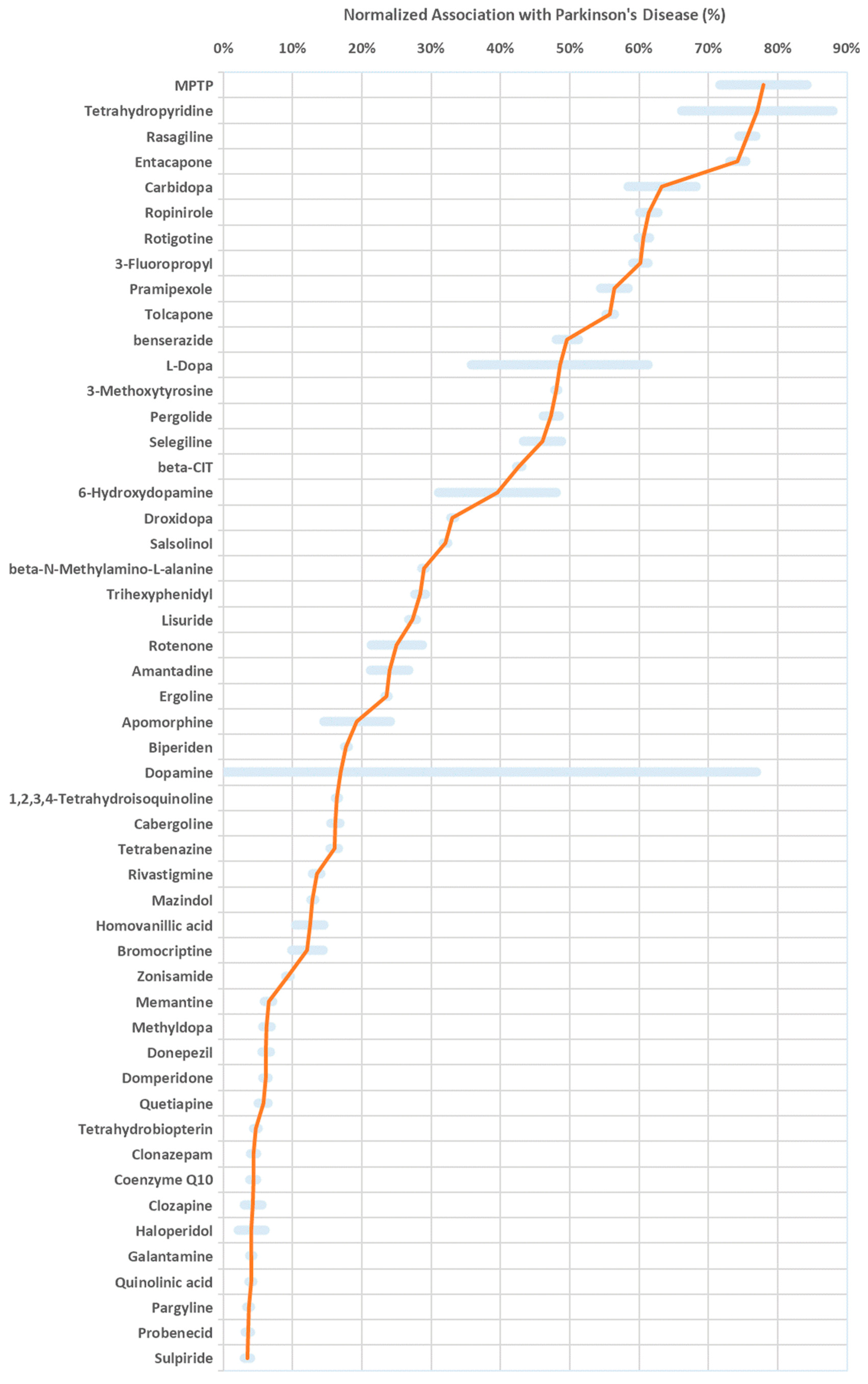 | Drug | L-Dopa (49%), Carbidopa (63%), Benserazide (50%), Entacapone (74%), Tolcapone (56%), Rasagiline (76%), Selegiline (46%), Pargyline (4%), Ropinirole (61%), Rotigotine (61%), Pramipexole (56%), Pergolide (47%), Lisuride (27%), Apomorphine (19%), Cabergoline (16%), Bromocriptine (12%), Zonisamide (9%) |