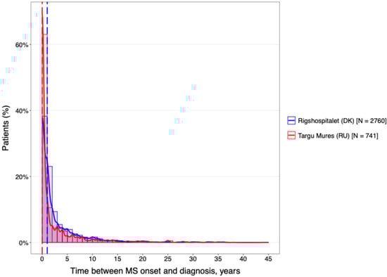 The temporal characteristics of the disease were remarkably consistent across both geographical regions (Figure 2). The cohorts were well-matched for disease chronicity, with a mean duration of 14.4 years at the DMSC and 14.2 years in Târgu Mureș. Furthermore, analysis of the diagnostic delay (Figure 3) revealed no statistically significant difference between the two centers (p > 0.05).