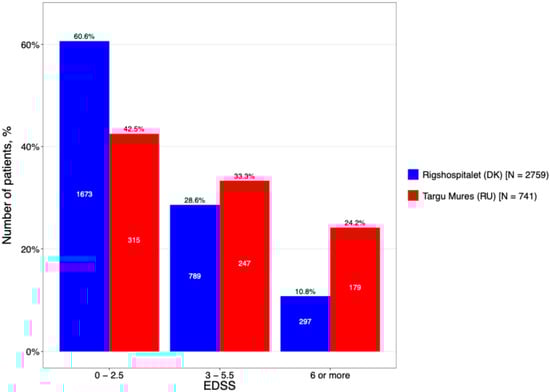 The compared cohorts showed no statistically significant differences in disease duration, age at disease onset (32.0 years in the Danish cohort vs. 32.4 years in the Romanian cohort), age at MS diagnosis (34.8 years vs. 34.6 years, respectively).