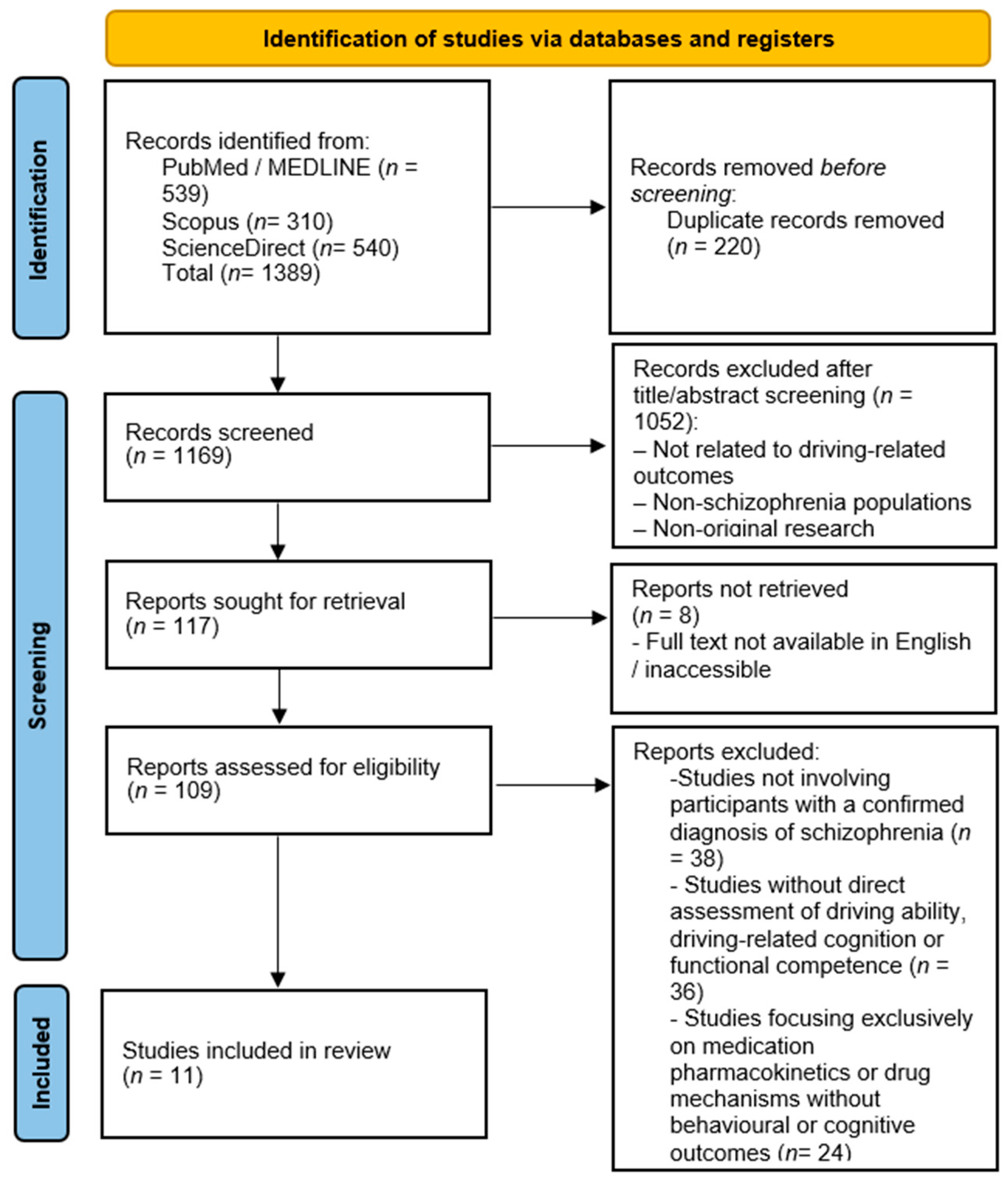 - Karakitsiou, G.; Plakias, S.; Arvaniti, A.; Katsikidou, M.; Kedraka, K.; Samakouri, M. Driving Performance in Schizophrenia: The Role of Neurocognitive Correlates—A Systematic Review. Brain Sci. 2025, 15, 1094. [Google Scholar] [CrossRef] [PubMed]
