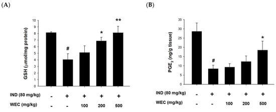 Effects of WEC on the contents of GSH and PGE2 and the protein levels of COX-1 and COX-2 of gastric mucosa in rats. The gastric contents of (A) GSH and (B) PGE2 were determined using commercial assay kits. Data are represented as means ± SD (n = 6). The protein expression of (C) COX-1 and (D) COX-2 was analyzed by Western blot. Data are represented as means ± SD (n = 3). # p < 0.05 compared with the control group. * p < 0.05, ** p < 0.01, *** p < 0.001 compared with the IND-treated group. + and − indicate with and without treatment, respectively.