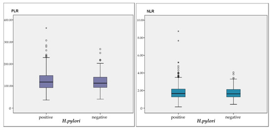 Clinical and biochemical characteristics according to the presence of H. pylori are summarized in Table 1. A total of 263 H. pylori-positive patients with a mean age of 47.87 ± 13.98 years, comprising 188 females and 75 males, and a total of 185 H. pylori-negative patients with a mean age of 51.30 ± 14.10 years, comprising 130 females and 55 males, were enrolled in the study. The mean age of H. pylori positive group was significantly lower than the H. pylori negative group (p = 0.011, p < 0.05). There were no differences in hemoglobin (HGB), mean corpuscular volume (MCV), leukocyte, neutrophil, lymphocyte, platelet, NLR, and PLR measurements between H. pylori-negative patients and H. Pylori-positive patients (p > 0.05). Patients with H. pylori had statistically significantly lower iron and ferritin compared to those without H. pylori (p = 0.029; p = 0.003). NLR revealed a statistically significant negative correlation between HGB, iron and, ferritin measurements in the correlation analysis of H. Pylori positive group (r = −0.133, p = 0.031; r = −0.270, p = 0.002; r = −0.162, p = 0.032). Again, with PLR, there was a statistically negative correlation between HGB, MCV, iron and, ferritin measurements (r = −0.310, p = 0.001, r = −0.187, p = 0.002, r = −0.335, p = 0.001; r = −0.290; p = 0.001) (Table 2). There was no statistical significance regarding both the PLR and NLR ratio distributions between the two groups (Figure 1).
