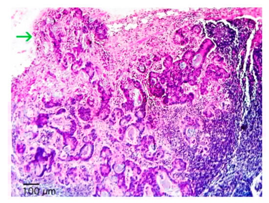Despite the fact that the Tumor-Node-Metastasis (TNM) system includes factors such as tumor deposits in the nodal category, it does not include additional prognostic factors present in the LNM, such as extra-capsular extension (ECE), defined as the dissemination of neoplastic cells through the nodal capsule into the adipose tissue (Figure 1). ECE is an important prognostic factor in cancers of the unknown primary [1], breast [2], head-and-neck [3], and vulva [4]. A systematic review about ENE as a prognostic factor in gastrointestinal neoplasms demonstrated their association with decreased survival in colorectal cancer (four studies, n = 502) [5]. Another systematic review of 13 studies (n = 1336) combining the colon and rectum finds a Hazard Ratio (HR) for death of 1.6 (95% confidence interval (CI): 1.32–2.17) for ECE+, but has moderate heterogeneity (I2 = 46%), which could be related with the combination of colon cancer with rectal cancer and some included studies addressed tumor deposits instead of ECE [6].