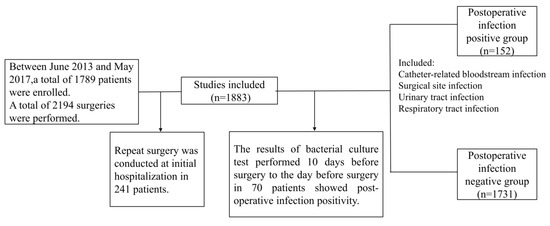 In this retrospective study, we enrolled 1789 adult patients who underwent GI surgery between June 2013 and May 2017 within the Division of Digestive and General Surgery, Niigata University Medical and Dental Hospital, Japan. In all patients, a total of 2194 operations were performed, which indicated that some patients were hospitalized and underwent GI surgery more than once. This study included only those patients who underwent a single operation during hospitalization. Hence, it excluded 91 patients who underwent several operations during initial hospitalization and 70 surgical procedures performed in patients who tested positive for infections in any bacterial culture tests conducted before the operation. As a result, 1637 patients who underwent a total of 1883 surgical procedures were included in this study. Among these patients, 198 underwent two surgical procedures, 37 underwent three surgical procedures, and 11 underwent more than three surgical procedures (Figure 1).