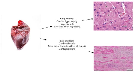 Prolonged exposure to β-adrenergic stimulation and an adverse biochemistry profile inadvertently leads to the remodeling of myocytes. In contemporary settings, this has been remarkably absent, possibly due to advances in the early recognition of cirrhotic patients, and to medical attempts to correct the biochemistry and reverse potential anatomical pathophysiology. Historical studies done in the 1950s by Lunseth et al. [] showed features of ventricular hypertrophy in patients with liver cirrhosis. Hearts from patients with cirrhosis weighed much more than standard populations at that time. Given diagnostic criteria at that time, those patients would meet criteria for CCM (Cirrhotic cardiomyopathy). Further histopathology showed remarkable features of ventricular hypertrophy, with larger nuclear vacuole and increased cytoplasmic depositing of fibrin (see Figure 2). This study also showed a quantitative relationship between the degree of disease severity and degree of cardiac hypertrophy. In twelve cases in these studies, there were features of cardiac fibrosis, with features of fibrous tissues, and these were associated with a longer duration of liver disease []. Studies done by Jellis et al. [] also show similar features of cardiac fibrosis in late-stage liver cirrhosis. In addition to that, the latest contemporary study performed by Wiese et al. [] shows features of increased fibrogenesis and increased extracellular volume in myocardium in cirrhotic, both with biochemical and anatomical evidence, further substantiating proof that cirrhosis does lead to permanent scarring of the myocardium through an inflammatory process.