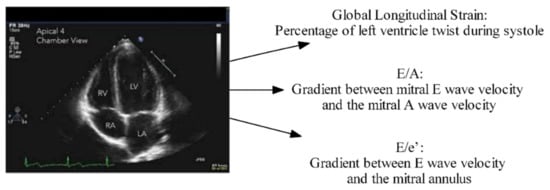 - Nagueh, S.F.; Smiseth, O.A.; Appleton, C.P.; Byrd, B.F., 3rd; Dokainish, H.; Edvardsen, T.; Flachskampf, F.A.; Gillebert, T.C.; Klein, A.L.; Lancellotti, P.; et al. Recommendations for the evaluation of left ventricular diastolic function by echocardiography: An update from the american society of echocardiography and the european association of cardiovascular imaging. J. Am. Soc. Echocardiogr. 2016, 29, 277–314. [Google Scholar] [CrossRef]