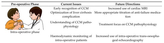 Patients with cirrhotic cardiomyopathy face significant risk in the pre-operative, intraoperative, and peri-operative period []. Liver transplantation has been thought of as the definitive intervention for cirrhotic cardiomyopathy [,]. Self-control studies have shown a significant reversal of cardiac changes post-transplant []. There is hope that the underlying process leading to improvement can be elucidated, and lead to future targeted therapies []. Following transplantation, there are improvements in QTc, exercise tolerance, echocardiography parameters, and biochemistry such as troponin and BNP. A summary of the issues for this discussion is shown in Figure 4.