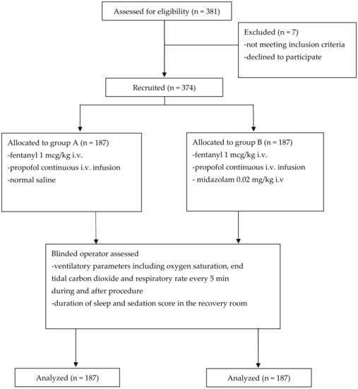 This study was conducted from July 2018 to January 2020, at a radiology unit, outside the operating room, in Siriraj Hospital, Bangkok, Thailand. Hepatic tumor patients who were at least 20 years of age and who presented for percutaneous RFA procedure were eligible for the study. Exclusion criteria included patients with severe cardiorespiratory diseases or end-stage renal disease, any clinical evidence of hepatic encephalopathy, American Society of Anesthesiologists (ASA) physical status of class IV or V, and refusal to participate in the study. A total of 374 consecutive patients were eligible and were randomized for the study. The study was approved by the Institutional Review Board of the Faculty of Medicine Siriraj Hospital (Certificate of Approval: Si086/2018) and verified by ClinicalTrials.gov (accessed on 1 March 2021): TCTR20180909002. All patients provided written informed consent for the study and the procedure.