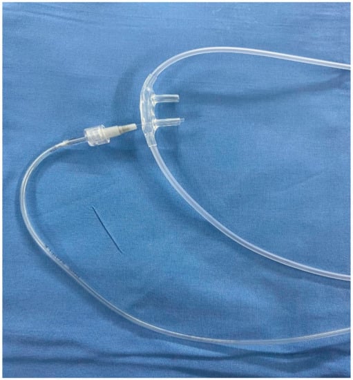 Each patient was monitored in the standard manner for blood pressure, heart rate, heart rhythm with single lead electrocardiogram, and oxygen saturation with pulse oximetry, as well as end tidal carbon dioxide (ETCO2). No other pre-medications were administered before the procedure. All patients in both groups were oxygenated with 100% O2 via nasal cannula (3 L/min). The ETCO2 was measured by using a newly developed nasal cannula with a carbon dioxide–sampling port. Our modified nasal cannula could be invented with a short venous catheter punctured through the nasal prong (Figure 2). Lastly, the nasal cannula could provide oxygen via one nostril and carbon dioxide could be sampled through the present invention one (Figure 3).