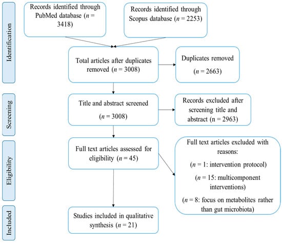 A total of 5671 articles on human trials and in vivo animal studies were retrieved from the preliminary search using Scopus and PubMed. Duplicate articles (n = 2663) were removed and the remaining 3008 articles were screened for the relevant title and abstract. A total of 2963 nonrelevant articles were further excluded, and the remaining 45 articles were screened for full content. Twenty-four articles did not meet the inclusion criteria and were excluded. Among those, fifteen studies were excluded because they used multi-component tea supplements in the intervention. Eight studies focused on urinary metabolites of the gut microbiota rather than the composition of the commensal microorganism; thus, they were excluded. One randomized control trial described only intervention protocols and, hence, was excluded. A total of 6 human trials and 15 animal studies were included in the final qualitative review (n = 21); Figure 1 shows the PRIMA flow diagram. Three human studies showed a “high” risk of bias, as assessed by the Jadad score (Table 1).