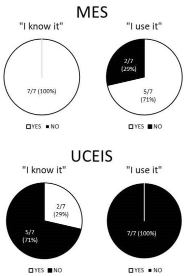 Among the hospital gastroenterologists, MES was known by 7/7 (100%), and currently used by 5/7 (71%), while UCEIS was known by 2/7 (29%) and currently used by none (Figure 1).