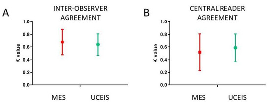 Performance of MES and UCEIS. Inter-observer agreement among the seven hospital endoscopists (A) and agreement with central reader (B) is represented. Data are expressed as k ± standard deviation.